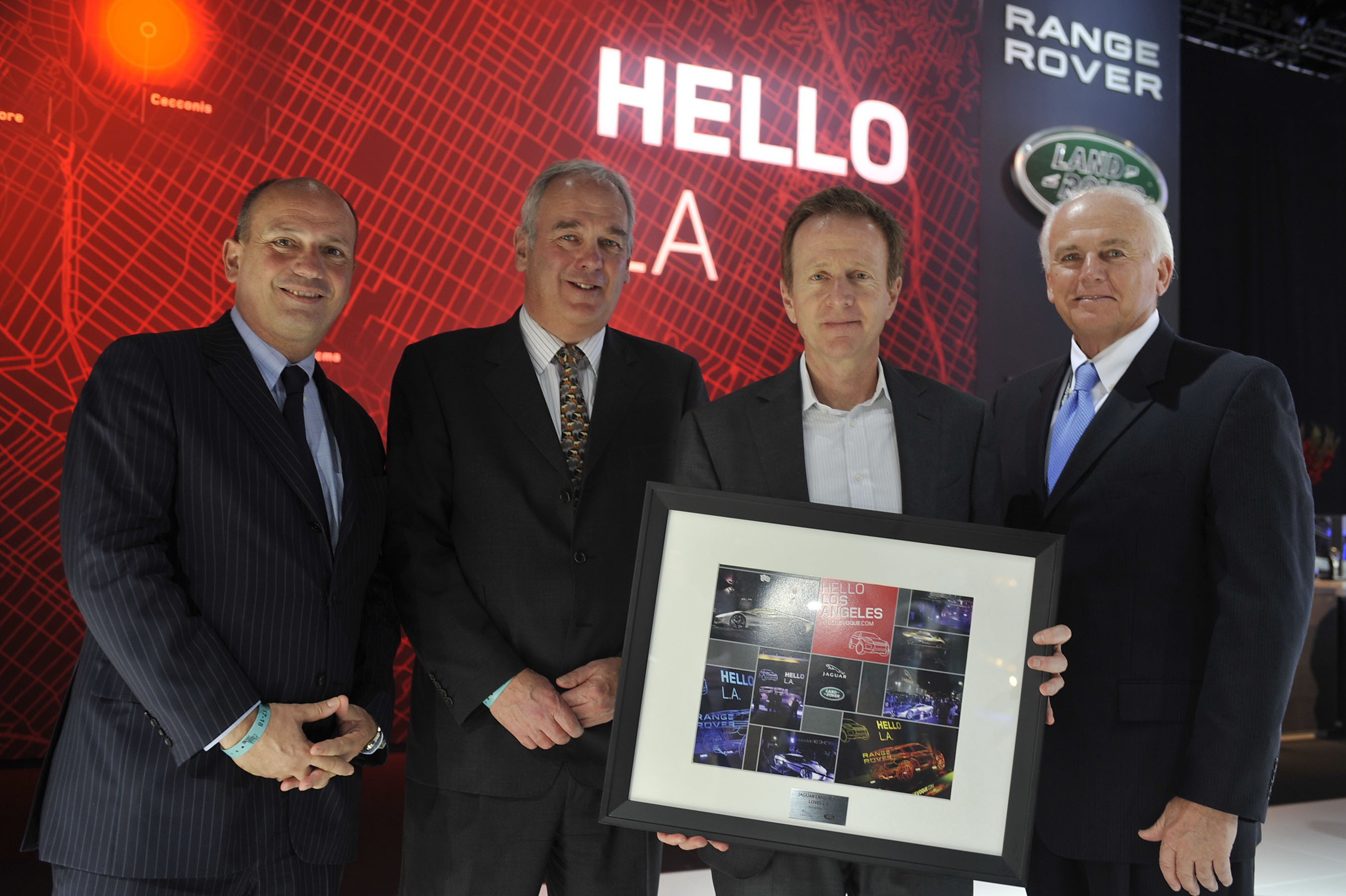 LOS ANGELES, Nov. 18, 2010 /PRNewswire/ — Jaguar Land Rover hosted Los Angeles’ First Deputy Mayor, Austin Beutner, at their show stand at the LA Auto Show on Wednesday, November 17 where Jaguar Land Rover Executives showed the delegation their auto show debut vehicles, the Range Rover Evoque and Jaguar C-X75 Electric Concept Vehicle. Jaguar Land Rover presented the Deputy Mayor with a framed display showcasing both brand’s recent Auto Show promotional activities in Los Angeles, demonstrating the excitement the company has for the Los Angeles marketplace. The company placed “Hello L.A.” banner ads around the city, displayed its vehicles at popular destinations and hosted VIP events. Frank Klaas, Global Head of Communications, said, “Los Angeles is the perfect setting for the world debut of our all-new five-door Range Rover Evoque and North American debut of our Jaguar C-X75 electric concept. Los Angeles is an international trend setting city and, of course, is the entertainment capital of the world. We were very pleased to share Jaguar and Land Rover with the City of Los Angeles.”